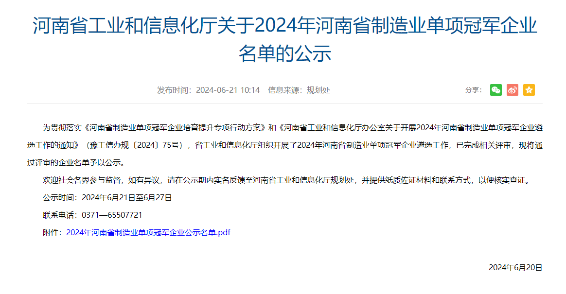 近日,河南省工業(yè)和信息化廳公示2024年河南省制造業(yè)單項(xiàng)冠軍企業(yè)名單,河南通達(dá)電纜股份有限公司成功獲評(píng)。